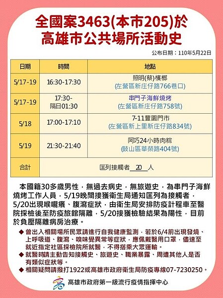 é«é21æ¥æ°å¢4ä¾ç¢ºè¨ºè¶³è·¡å¨é裡 from s.yimg.com May 18, 2021 · 5月15日12時50分至13時10分至全聯福利中心高雄林森店購物約20分鐘。 14時5分至15分至鳳山區東急屋百貨連鎖停留約10分鐘。 5月16日因發燒,自行至急診. Jun 02, 2021 · 高雄某家連鎖早餐店的店長,疑似確診還傳染給三名家人,向客人致歉//,同時表示衛生局將會匡列5/21到30號的客人,並且. May 17, 2021 · 高雄市衛生局今天公布案1598、1751確診個案在高雄的足跡,包括了義享天地、大順路好市多等處,共匡列55名密切接觸者居. Jun 12, 2021 · 雲林縣12日再增1名本土確診案,案12838為雲林縣麥寮鄉台塑六輕工業區員工,本月5日出現身體不適,9日回高雄住處、11日就醫確診,目前工業區已有5. Jun 23, 2021 · 中央流行疫情指揮中心今天公布國內新增104例,高雄暴增9例確診個案,主要來自旗山、仁武兩個群聚,兩群聚的指標個案都有.